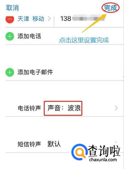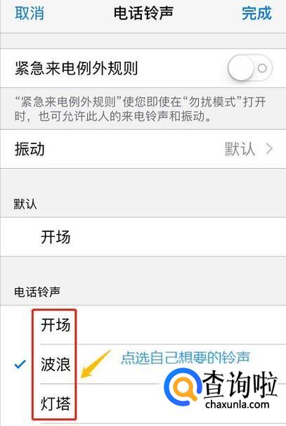 点击铃声选项,我们就可以单独给他设置系统自带的其他铃声了,选择完毕以后在页面右上角点击"完成",以后此人来电就会是单独的铃声了,如图所示...