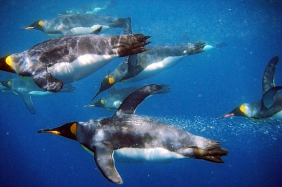 帝企鹅游泳速度为每小时6-9公里,甚至可以实现高达每小时19公里的短距离飞速。要潜到约50米的海面下,在那里可以很容易地发现冰海中的鲜鱼,在海洋表面逆流而行。然后,再次潜水和浮出水面呼吸,重复上述步骤。他们还可以在冰的裂缝中吹泡,将隐藏的鱼逼出来。在捕食区内,帝企鹅会反复潜入海底深处寻找食物。它们通常下潜到150-250米,有最深潜水达565米的记录,可以屏住呼吸在水下时为15-20分钟,通常以大海中的鱼虾和头足类动物为食。