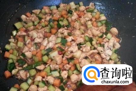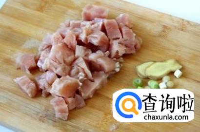 把鸡胸肉洗干净切成小丁,青瓜、红萝卜切成小丁,蒜蓉、姜蓉准备好。