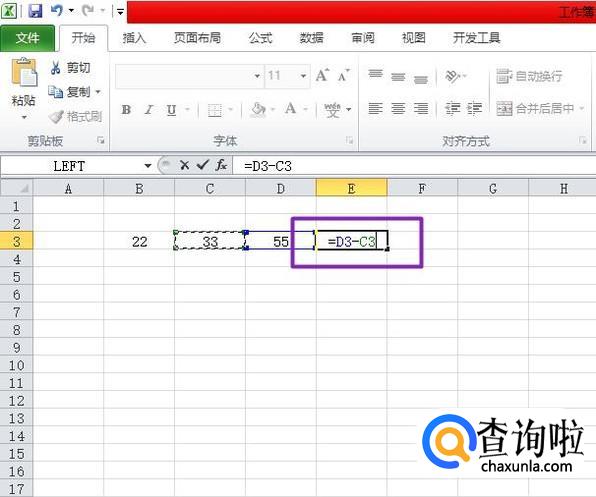然后我们选中55后面的那个单元格,在里面输入=D3-C3,然后按回车键,这样就求出两数相减之差了;