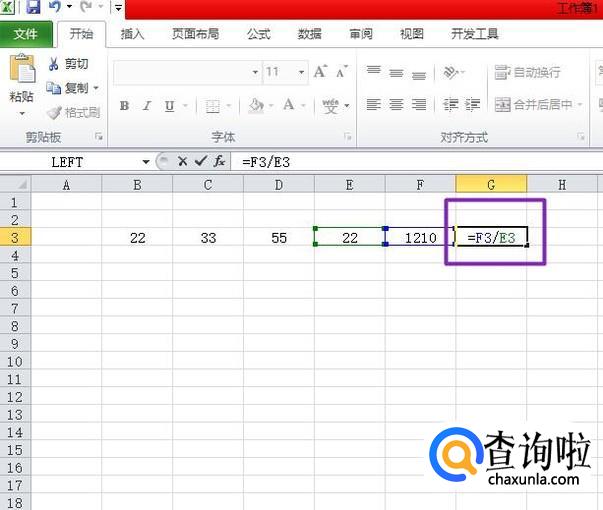 然后我们选择1210后面的那个单元格,在里面输入=F3/E3,之后按回车键,这样就可以求出两个数相除的结果了。