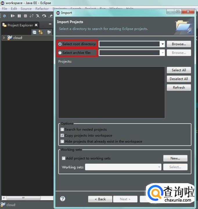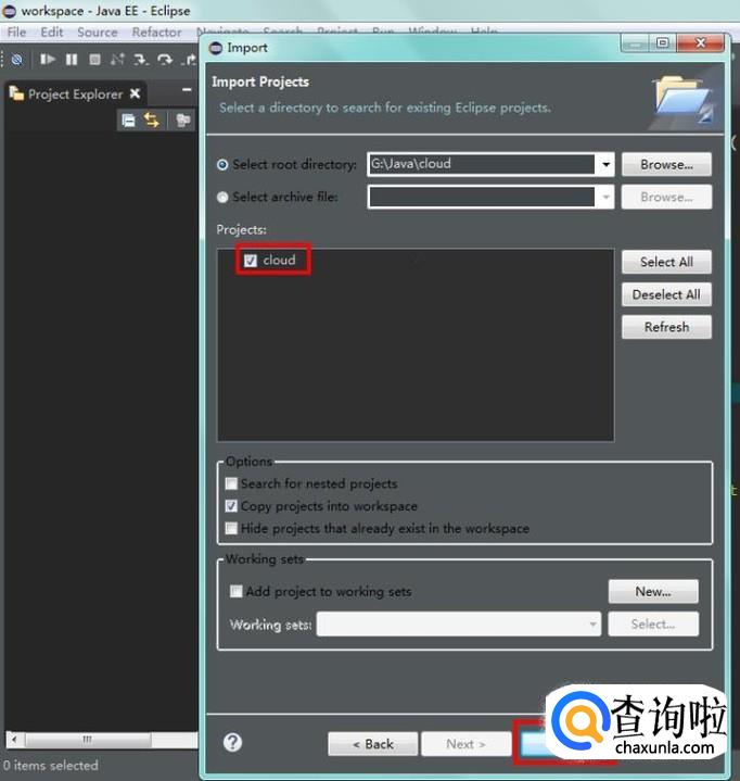 如果正在使用的工作目录中没有刚刚选择的项目,项目框中的项目会被自动勾选,否则会提示有相同项目,不能导入,最后点击“Finish”,等待导入;