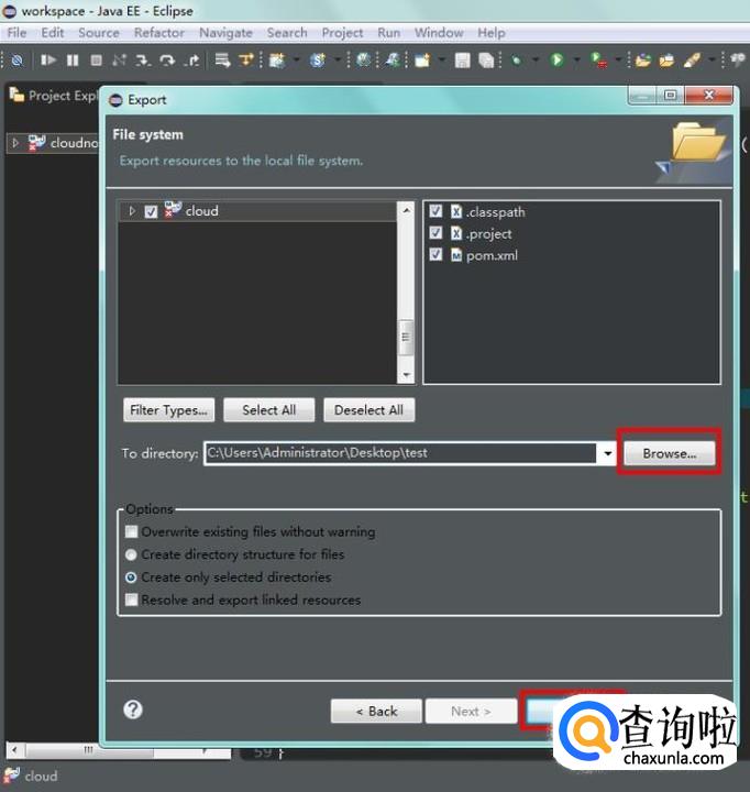 先勾选要导出的项目,再浏览导出的路径,最后点击“Finish”,等待结束,到导出的目录下就可以看到完成的项目文件了;