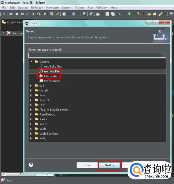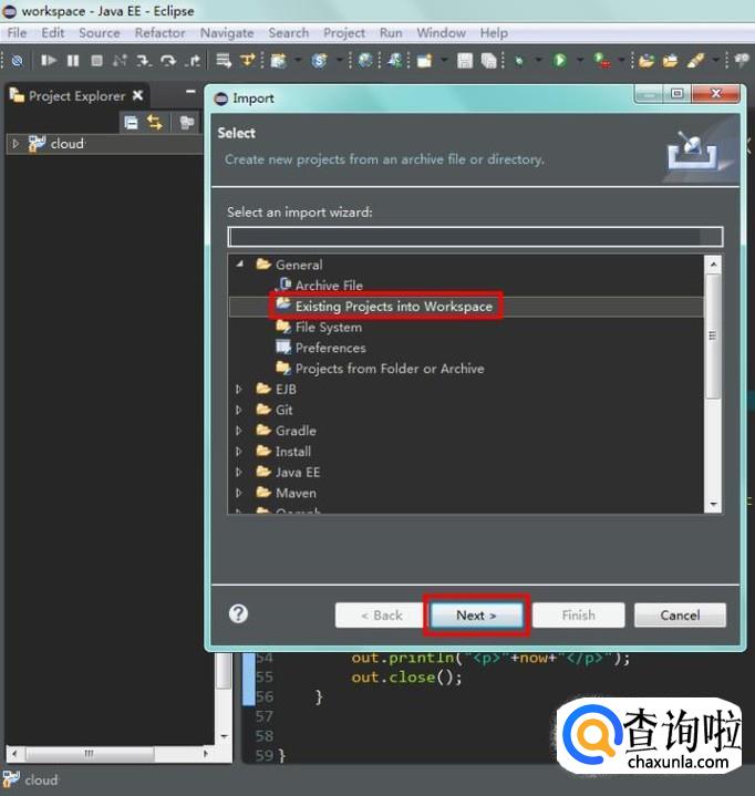 在弹窗中选择“General”的第二项“Existing Projects into Workspace”,意思是现存项目导入工作目录,再点击“Next”;