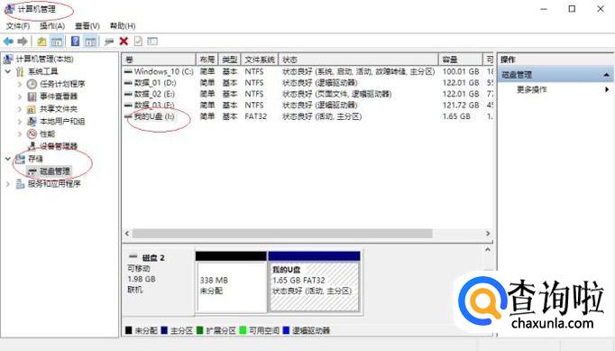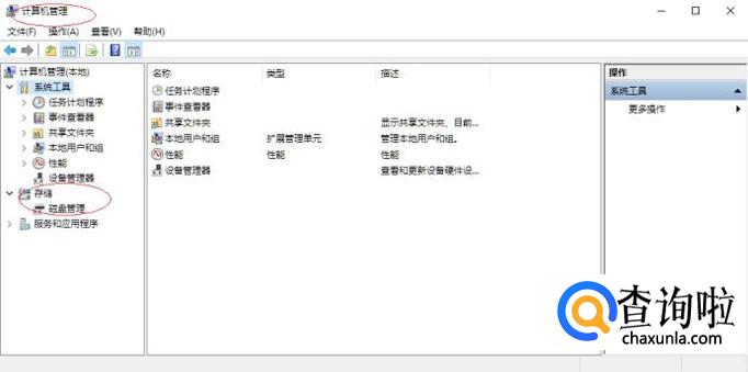 唤出"计算机管理"程序窗口,如图所示。展开左侧树形目录结构,选择"存储→磁盘管理"项。