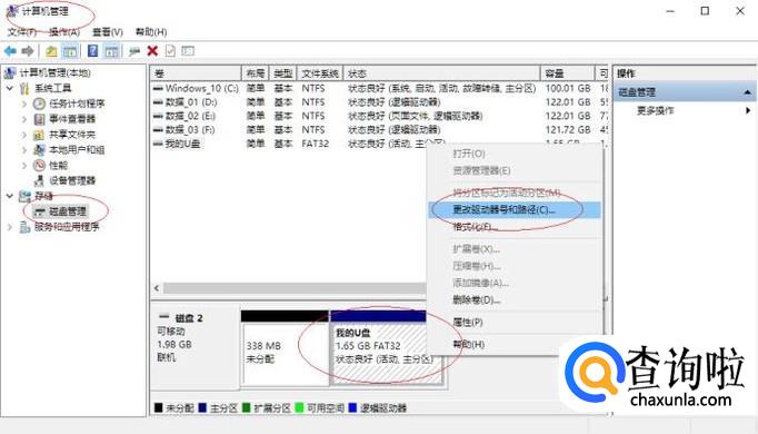 如图所示,鼠标右击"磁盘2→我的U盘"图标。弹出快捷菜单,选择"更改驱动器号和路径..."项。