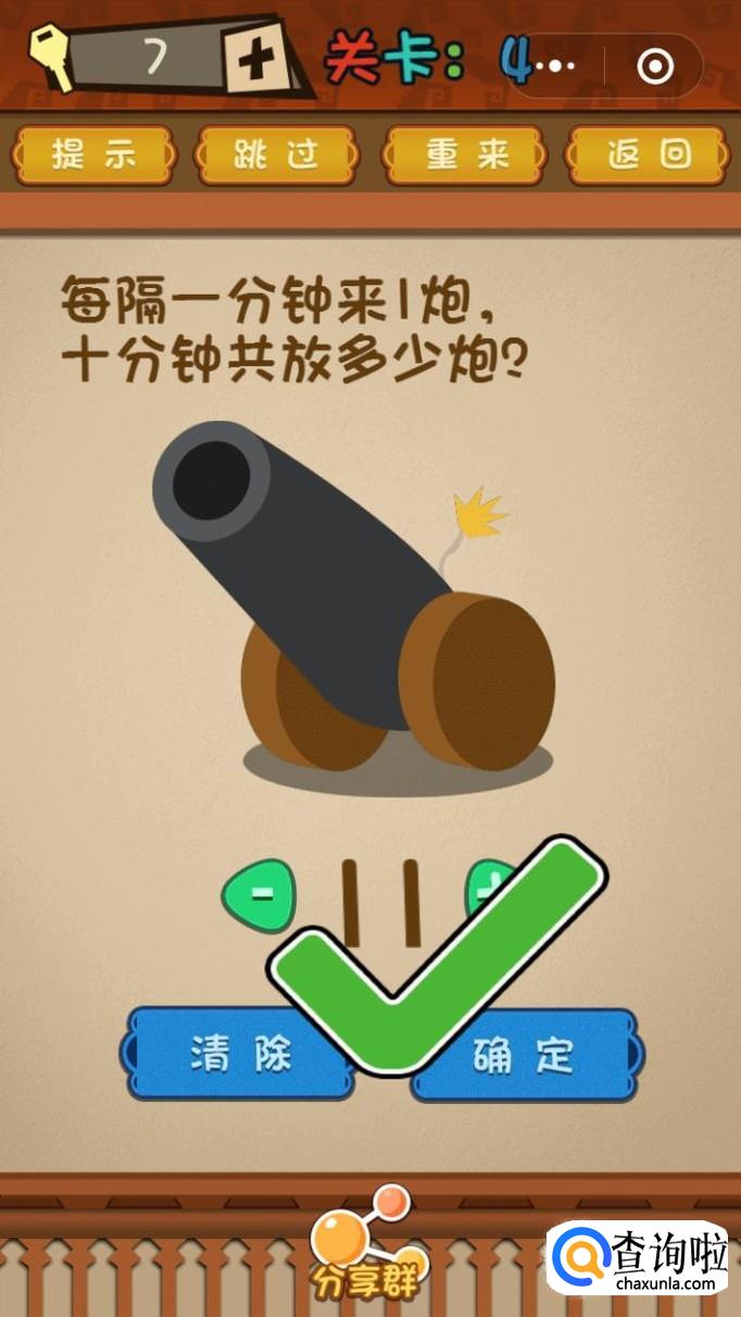 第4关,每隔一分钟来1炮,十分钟共放多少炮?