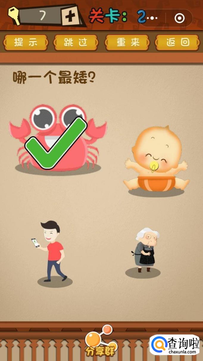又是个思维题,跟上一题完全相反,螃蟹当然是最矮的。