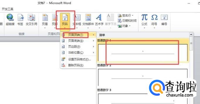 之后我们点击页码,弹出的界面,我们点击页面顶端,然后我们点击第一个;