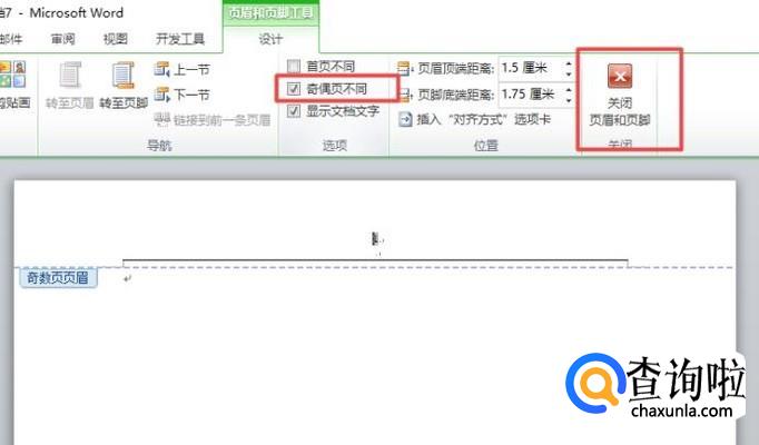 然后我们将奇偶页不同给勾选上,之后点击关闭页眉和页脚就设置好了。