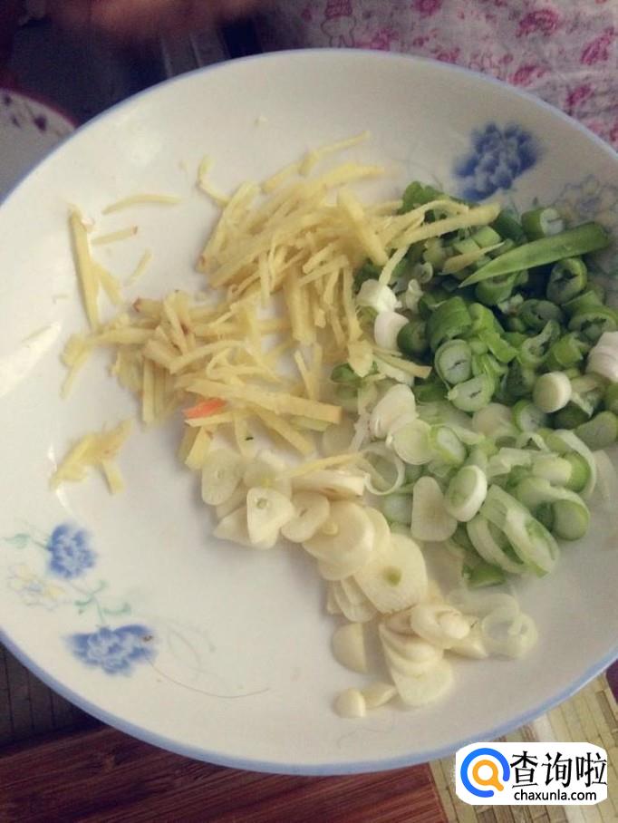 接着把姜切成姜丝,大蒜切成段。