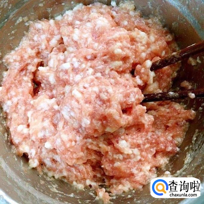 首先将肉剁碎并用适量的蒜蓉和面粉裹一下。