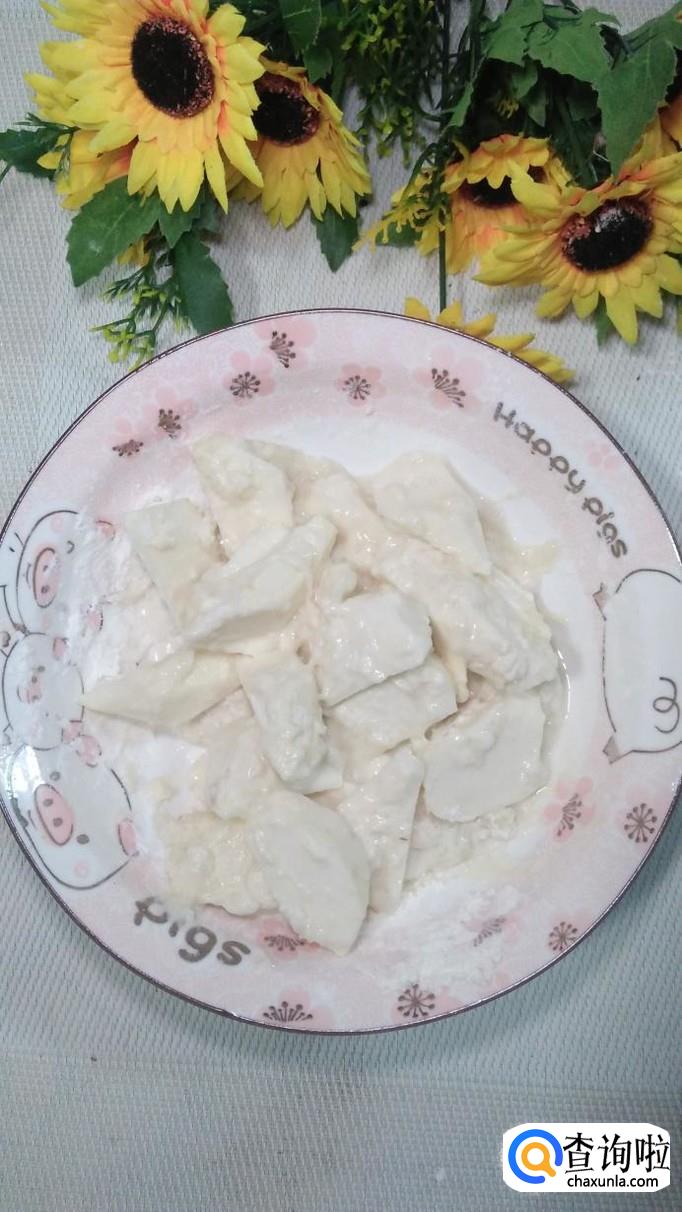 加入适量清水,尽量顺着一个方向搅拌,搅拌均匀,让红薯块均匀的沾上面糊。