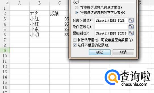 接着勾选选择不重复的记录并点击确定,如下图所示。