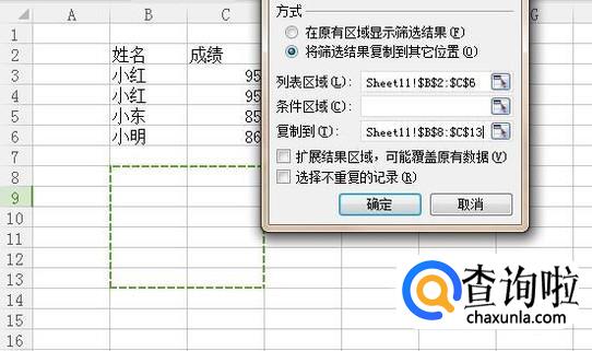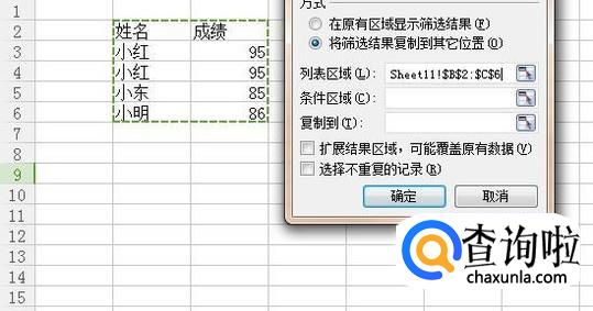 接着勾选将筛选结果复制到其他位置并选择好整个表格作为数据来源,如下图所示。