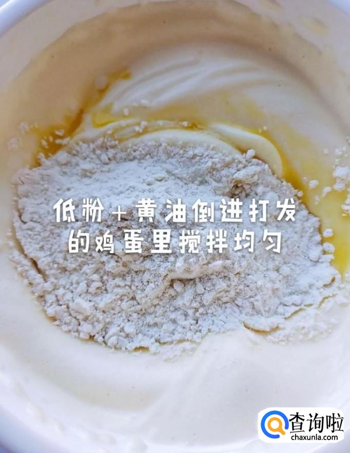 然后往鸡蛋中加入低粉和黄油,搅拌均匀,如下图所示。