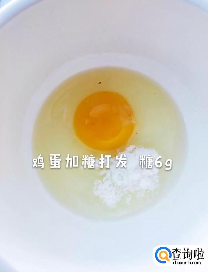 然后在一个碗中打入一颗鸡蛋,加入糖打发,如图所示。
