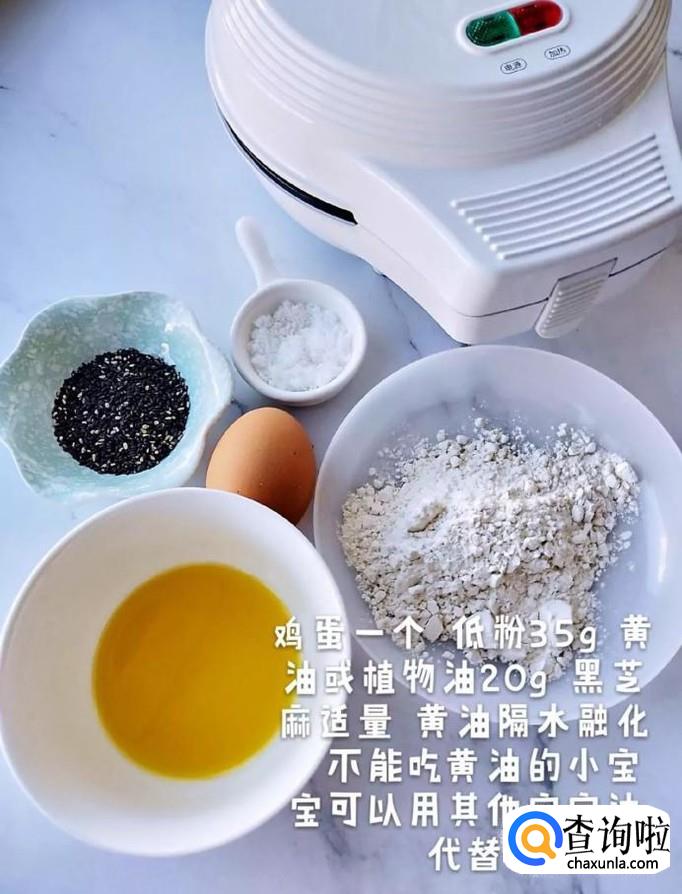 首先准备好所有的食材,如下图所示。小贴士:鸡蛋一个,低粉35克,黄油20克,黑芝麻适量。