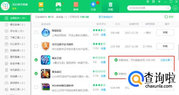 下载完成后,进入360软件管家,点击“卸载”,在列表里选中想要卸载的程序,点击卸载。