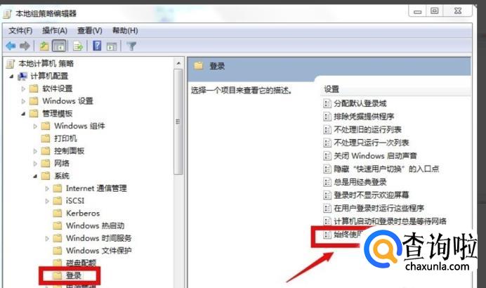 会跳转到“本地组策略编辑器”,再依次选择【计算机配置】-【管理模块】-【系统】-【登录】。找到“始终使用自定义登录背景”并双击。