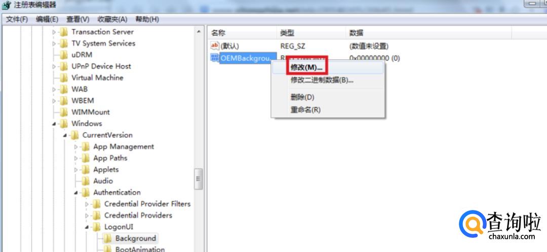 鼠标右键单击“OEMBackground”,选择“修改”。