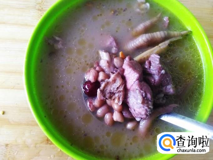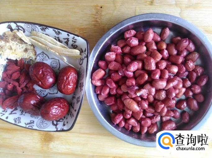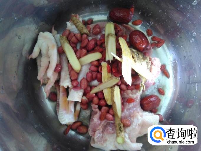 鸡脚150克,瘦肉200克,红皮花生150克,当归、枸杞、红枣、黄芪、姜片适量。