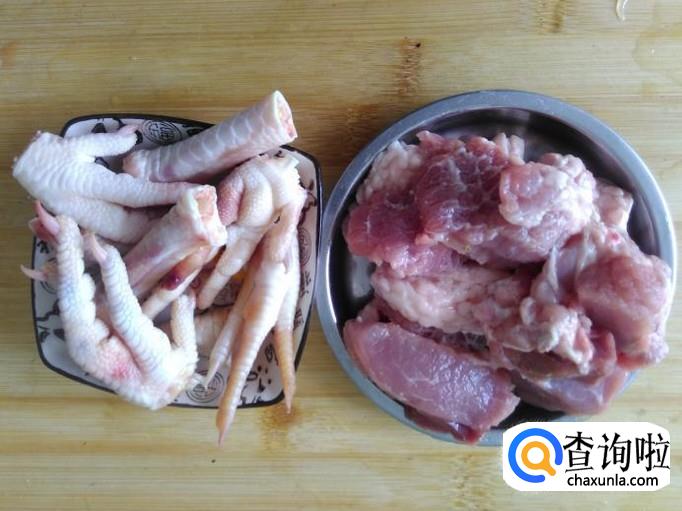 把鸡脚清洗干净斩成一段段,瘦肉切成大方块。