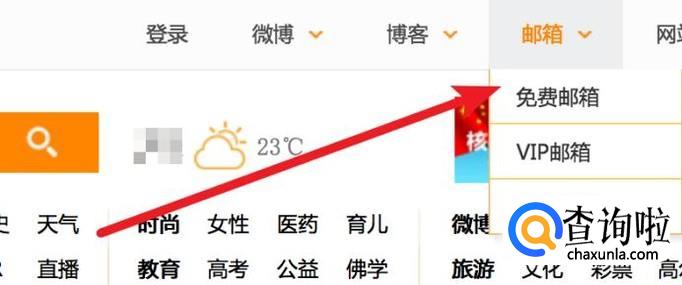 打开新浪网站,在上方的菜单‘邮箱’下,点击‘免费邮箱’。