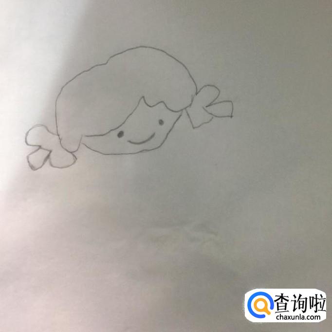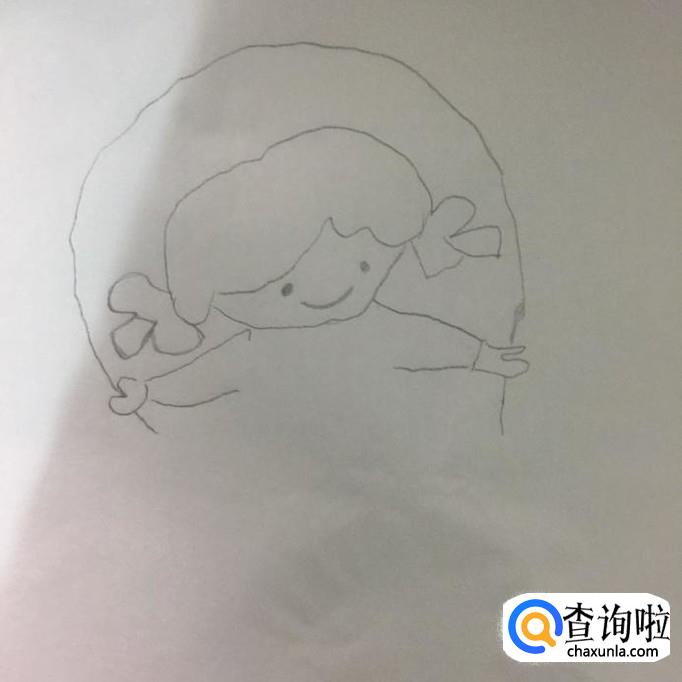 首先用铅笔在A4纸上画出小女孩的头发和蝴蝶结,如下图所示。画这部分的时候应该画的左低右高,会比较好。