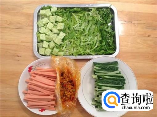 然后我们还要准备其他配料,黄瓜切丝、火腿肠切丝,再准备肉松和海苔备用。
