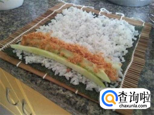 寿司席上第一层先铺海苔,然后裹上一层米饭,最后加入黄瓜丝和火腿丝以及肉松等配料。
