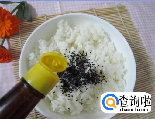 家常寿司制作起来十分简单,首先我们要提前准备好米饭,其中糯米的比例要高一点,这样口感比较好,然后在米饭中倒入黑芝麻和白醋一起搅拌。