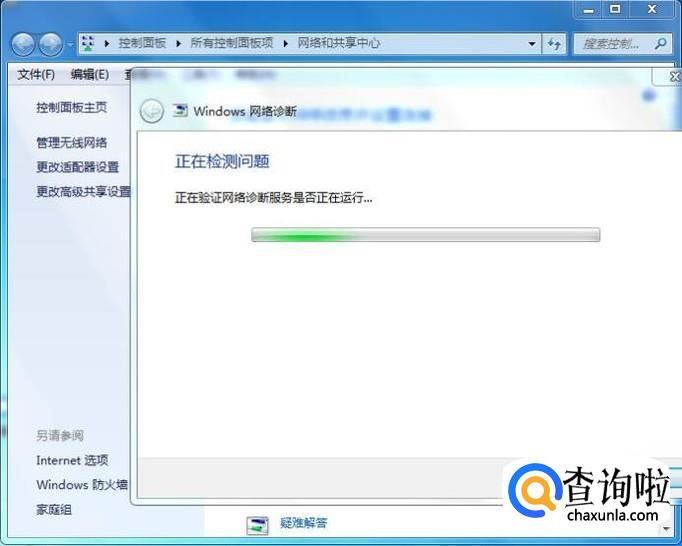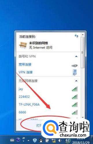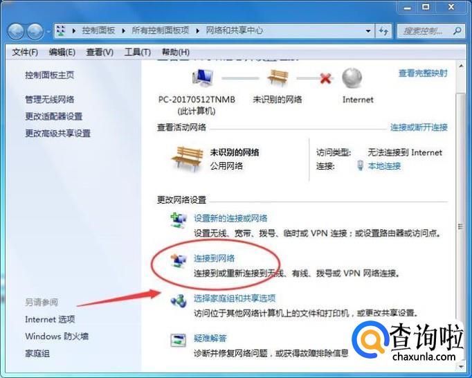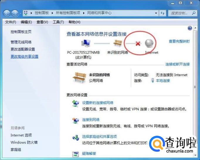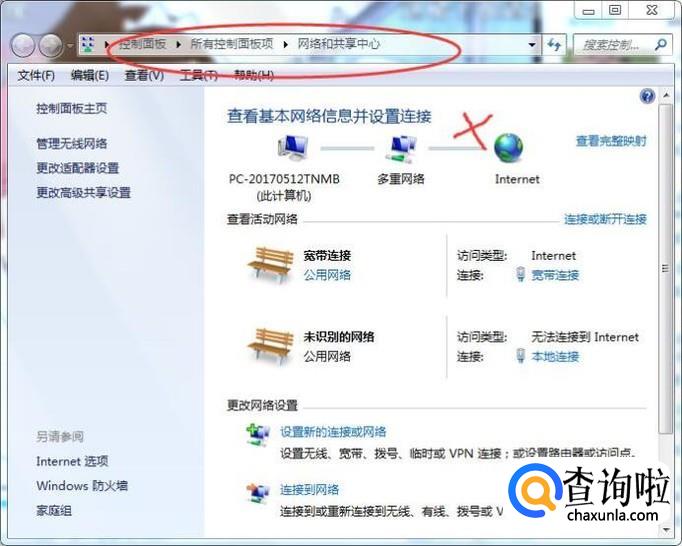 如果出现黄色感叹号的话,说明是网络没连接成功,点击【网络和共享中心】,如下图所示: