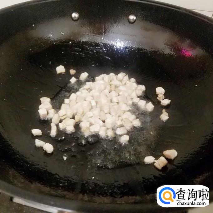 放入肉丁煸炒,肉丁变色,放入葱,姜爆香。