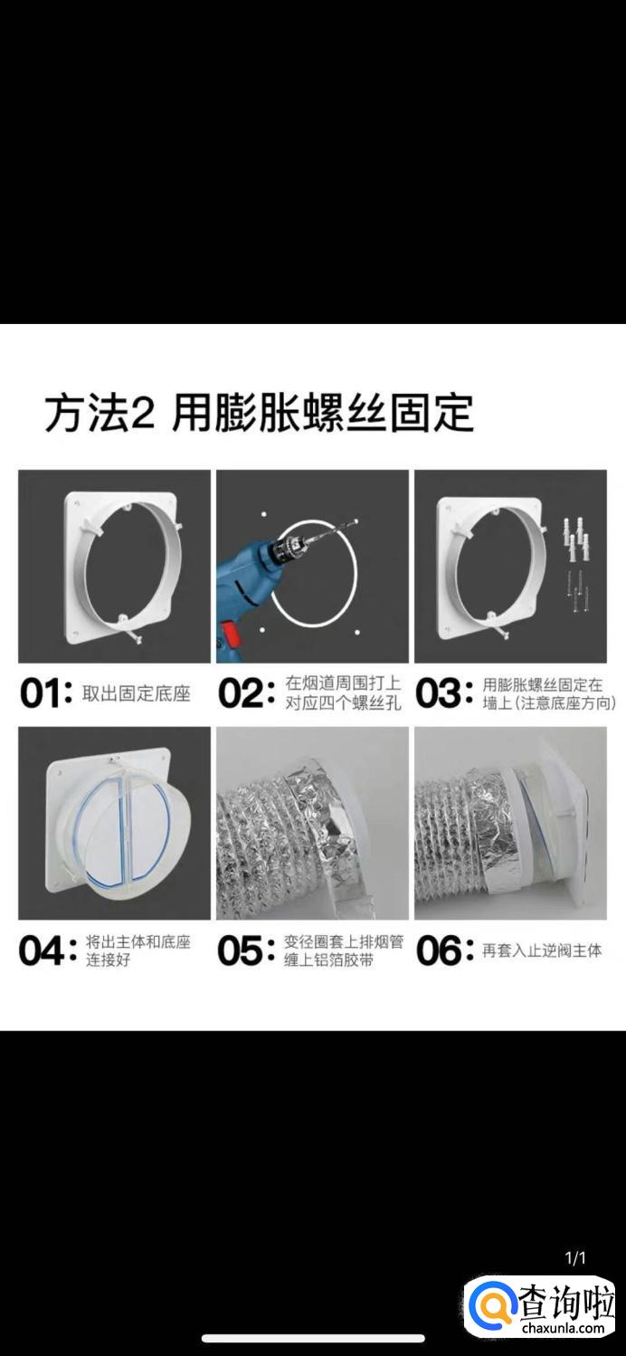 第二种使用膨胀螺丝固定,但是这个方法需要用电钻在墙上打洞比较麻烦。需要现在烟道打上四个螺丝孔哦那个,用膨胀螺丝固定在墙上,再在变径圈套上排烟管缠上铝箔胶带,套入止逆阀主体。因为油烟比较顽固,提醒大家后期使用的过程需要经常观察和维护。要不然很容易产生使用故障。