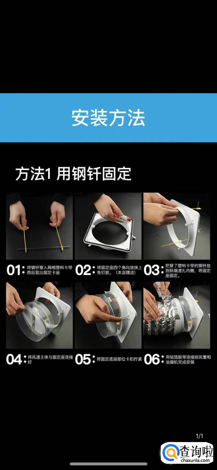 第一种就是最常用的用钢钉安装。将钢钎穿入两根塑料卡带,然后取出固定卡座,将钢钎放到排烟道内侧,将底座固定,再将风道主体与底座连接好,用耐热的铝箔胶(这里不推荐使用透明胶带,有重大的安全隐患,不能够耐高温)连接排风管。