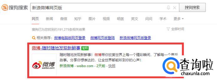 在搜索结果中打开微博官网,如图所示,后面带了官网标识。