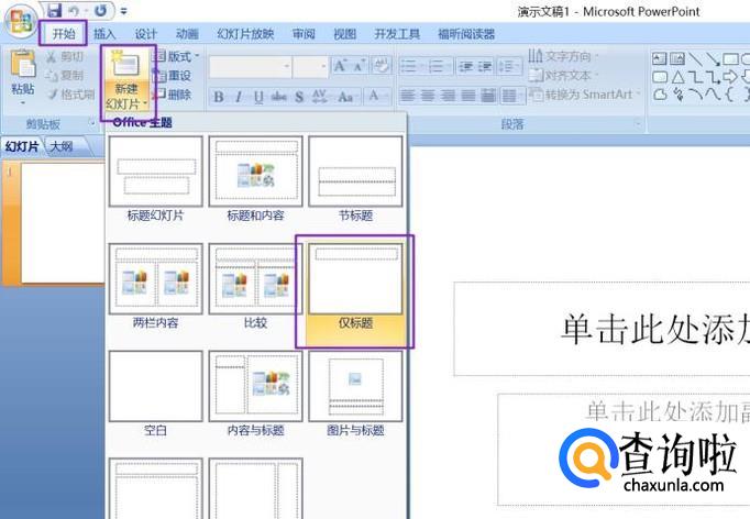 首先,打开office2007,然后选择开始菜单栏中的新建幻灯片,然后选择仅标题的幻灯片模板;