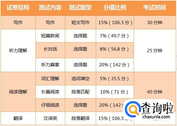 由于阅读题中选词填空难度系数最大,所以,做阅读题时先做其它两项,把翻译放在选词填空前面做,方便节省答题时间,避免考试时,题做不完。