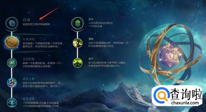 主符文启迪:启迪的符文适合辅助英雄和脆皮英雄,前期点启迪可以获得一个秒表,增强保命能力。副符文建议搭配坚决。