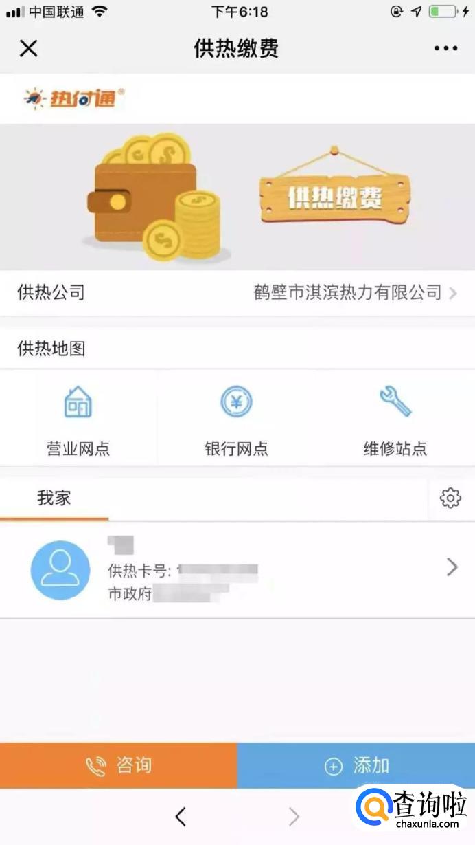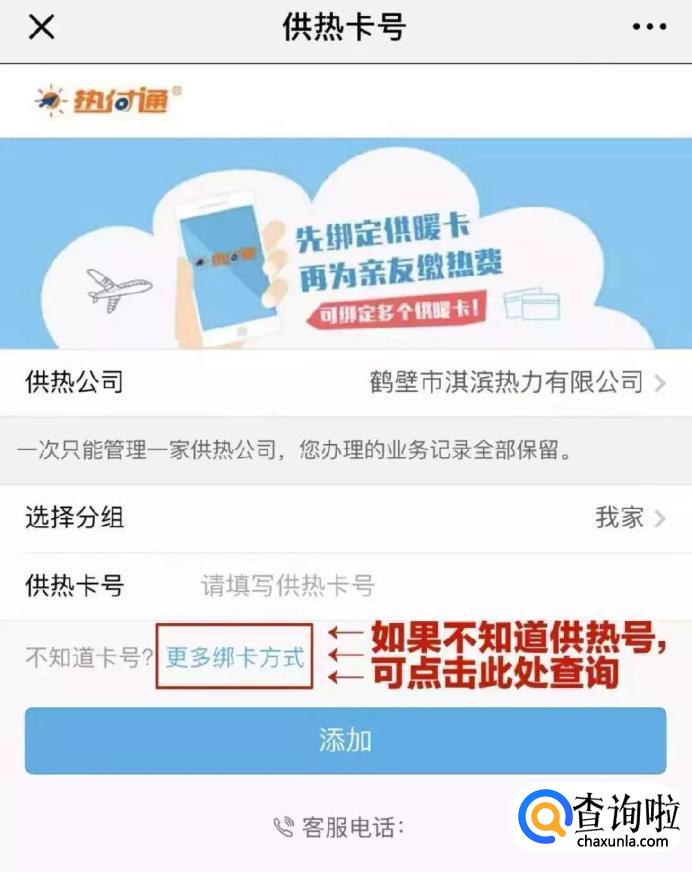 有的热力公司开通了微信公众号,你可以关注微信公众号进行咨询。这里以例如鹤壁市淇滨热力有限公司为例,关注公众号后,在菜单栏业务办理中选择供热缴费,绑定供暖卡页面点击更多绑卡方式,通过输入小区楼号和详细家庭住址进行卡号查询。