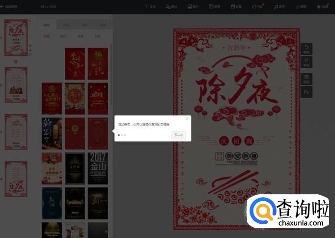 进入想要使用的模板,开始编辑。初次进入,会给提示。左边是效果编辑设置。