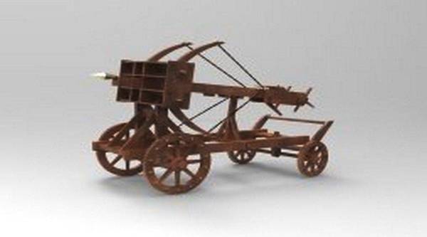 在设计攻城武器——轮转式发石车方面,马钧设计了一种新式轮转式发石车,利用一个木轮子,把石头挂在木轮上,装上机械带动轮子飞快地转动,可以把大石头接连不断地发射出去,使敌方来不及防御,威力相当巨大。