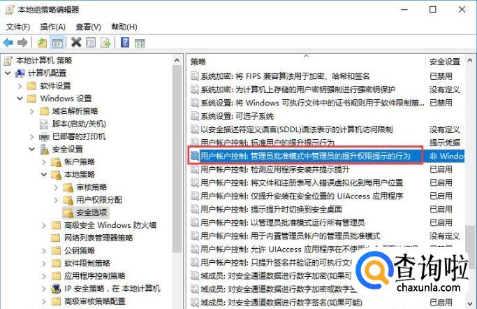 在右侧策略列表中找到如图所示的用户账户控制。