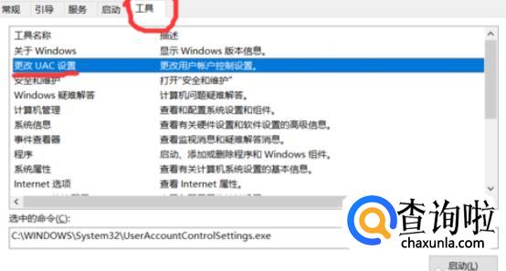 然后在系统配置中选择工具,在工具中点击更改UAC设置,点击启动。