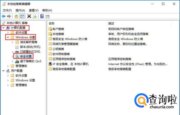 在计算机配置中点击windows设置,再点击下面的安全设置。