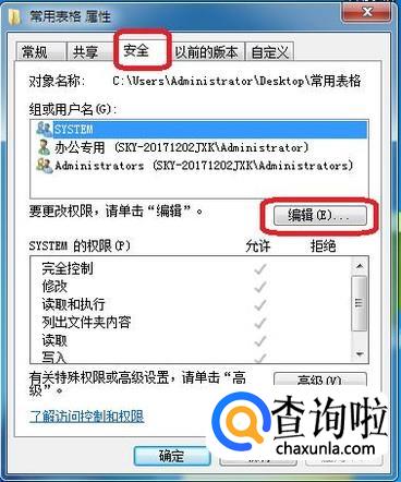 在属性面板中,我们单击“安全”选项卡,如图所示,如果需要修改“组或用户名”的权限,我们只要选中该用户,点击“编辑”按钮。