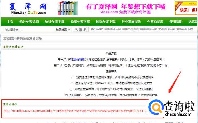 再次进入夏泽网,将会在搜索下方,看到“您所申请的注册码为:xxxxxx”,每个时间段生成的注册码都不同,复制此注册码,填入步骤6的注册码框内,再填上其他基本信息,即可完成账号注册,查看免费年鉴。
