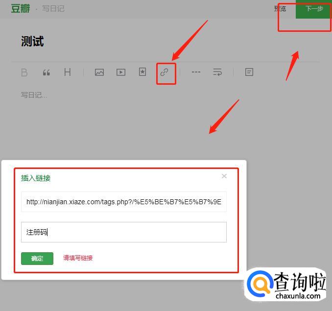 输入标题,正文部分使用超链接功能,将刚刚复制的夏泽网红色链接粘贴到超链接第一行内,第二行写上注册码,点击【确定】,再点击【下一步】。
