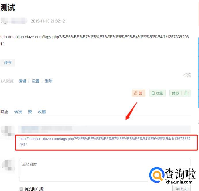 日志发布后,我们就能看到刚刚编辑的日志内容,再回复框内再次粘贴夏泽网的红色链接,点击回复,在回复框就能看到链接,点击回复框的链接。
